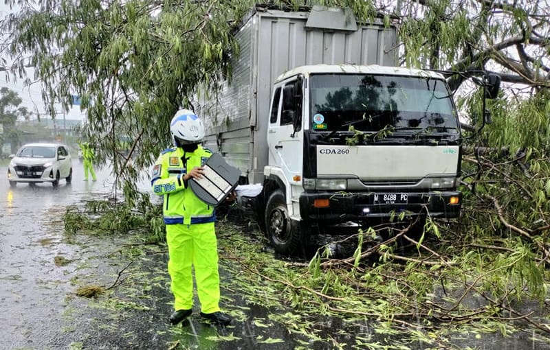 “Akibat curah hujan yang mengguyur Kota Mojokerto, menyebabkan pohon di Jalan Raya Bypass tumbang, sehingga menimpa truk tronton bernopol W 8488 PC yang parkir dibawahnya,” Ucap IPTU Sukaren.