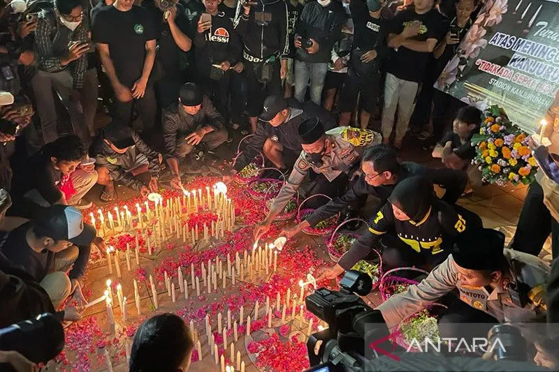 Mereka juga menyalakan lilin sebagai duka cita dan keprihatinan terhadap tragedi Kanjuruhan usai pertandingan Arema FC melawan Persebaya, Sabtu malam pekan lalu.