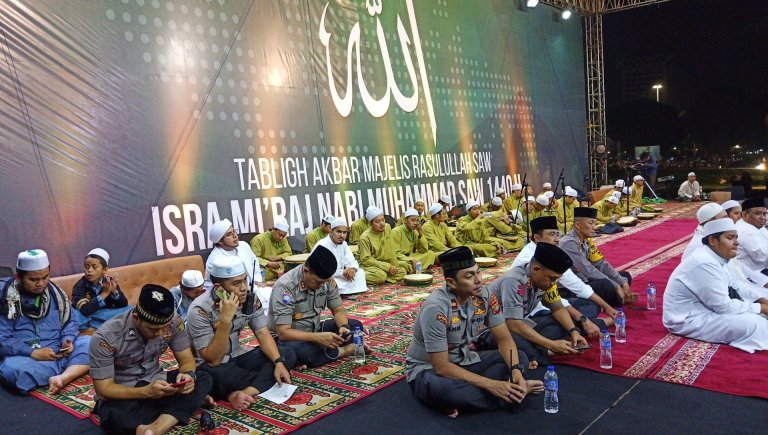 Jakarta, Maspolin.id – “Isra Mi’raj adalah peristiwa besar yang dialami junjungan kita, Baginda Nabi Muhammad SAW. Membawa banyak hikmah dan pelajaran untuk kita semua. Disamping perintah untuk menunaikan shalat lima waktu, hikmah lain adalah menjaga lisan dan ucapan kita, “ujar Kapolda Metro Jaya, Irjen Pol Dr Gatot Eddy Pramono MSi, di hadapan jamaah Majelis Rasulullah yang menggelar tabligh akbar di Monas Jakarta Pusat, Selasa (2/4) tadi malam.
