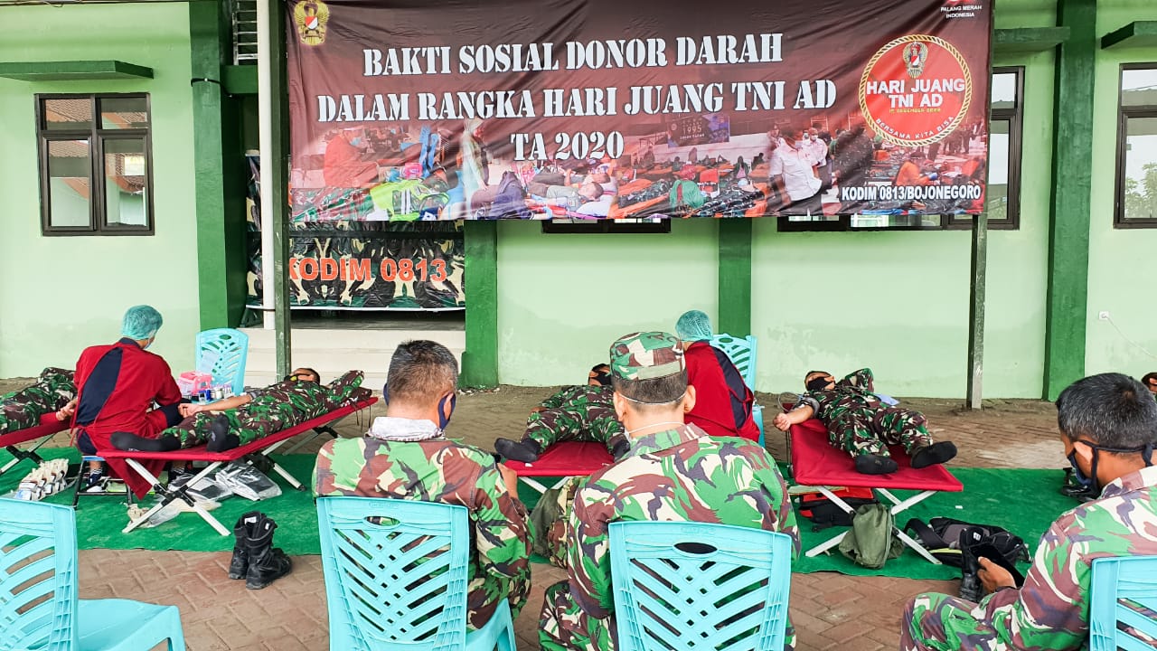 MASPOLIN || BOJONEGORO, – Memperingati Hari Juang Kartika tahun 2020 dan Hari Ulang Tahun (HUT) Ke- 72 Kodam V Brawijaya, pada Selasa (8/12/2020) Kodim 0813 Bojonegoro, Jawa Timur, menyelenggarakan bakti sosial donor darah di Markas Kodim setempat.