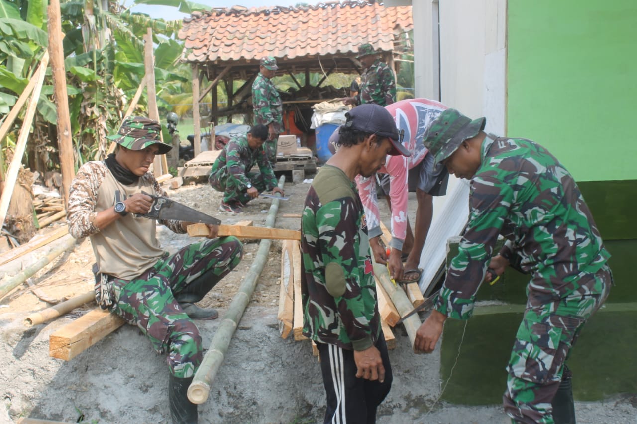Satgas TMMD memanfaatkan beberapa bagian rumah yang bisa dipakai, setelah dibongkar beberapa hari yang lalu, dan Satgas TMMD mulai membuat kerangka bangunan dapur.
