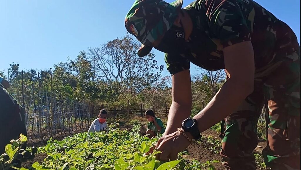 Belu, Maspolin.id—Selain menjaga kemananan di wilayah perbatasan Indonesia – Timor Leste, ternyata Satgas Pamtas RI-RDTL sektor timur Yonif Raider 142/KJ memiliki tugas lain dibidang Pembinaan Teritorial Satuan Non Komando Kewilayahan (Binter Satnonkowil) bagi masyarakat sekitar di daerah penugasan yang bertujuan untuk meningkatkan kesejahteraan rakyat menjadi lebih baik, hal ini terlihat dalam kegiatan berkebun yang dilaksanakan personel Pos Dafala bersama warga sekitar yang berada di Dusun Dubasa A Desa Dafala Kecamatan Tasifeto Timur Kabupaten Belu, Nusa Tenggara Timur.