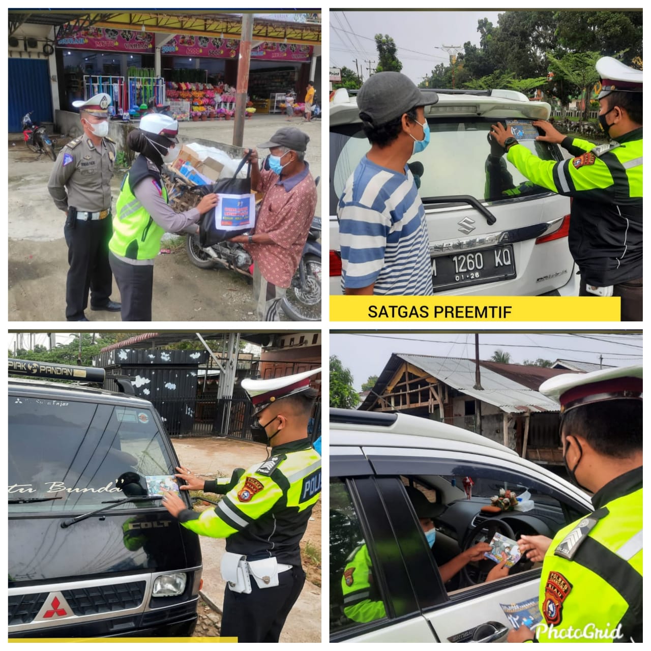 Disampaikan Kasat Lantas Akp Rivandy,” hari ini kita melakukan kegiatan Deteksi Dini, Sosialisasi / Himbauan via media elktronik / Radio, Sosialisasi informasi dengan Melaksanakan Penerangan keliling, Pemasangan Spanduk, Penyebaran Brosur, Pembagian Bansos dan Sosialisasi Protokol kesehatan covid 19 di tempat Rawan Kerumunan,’ urainya