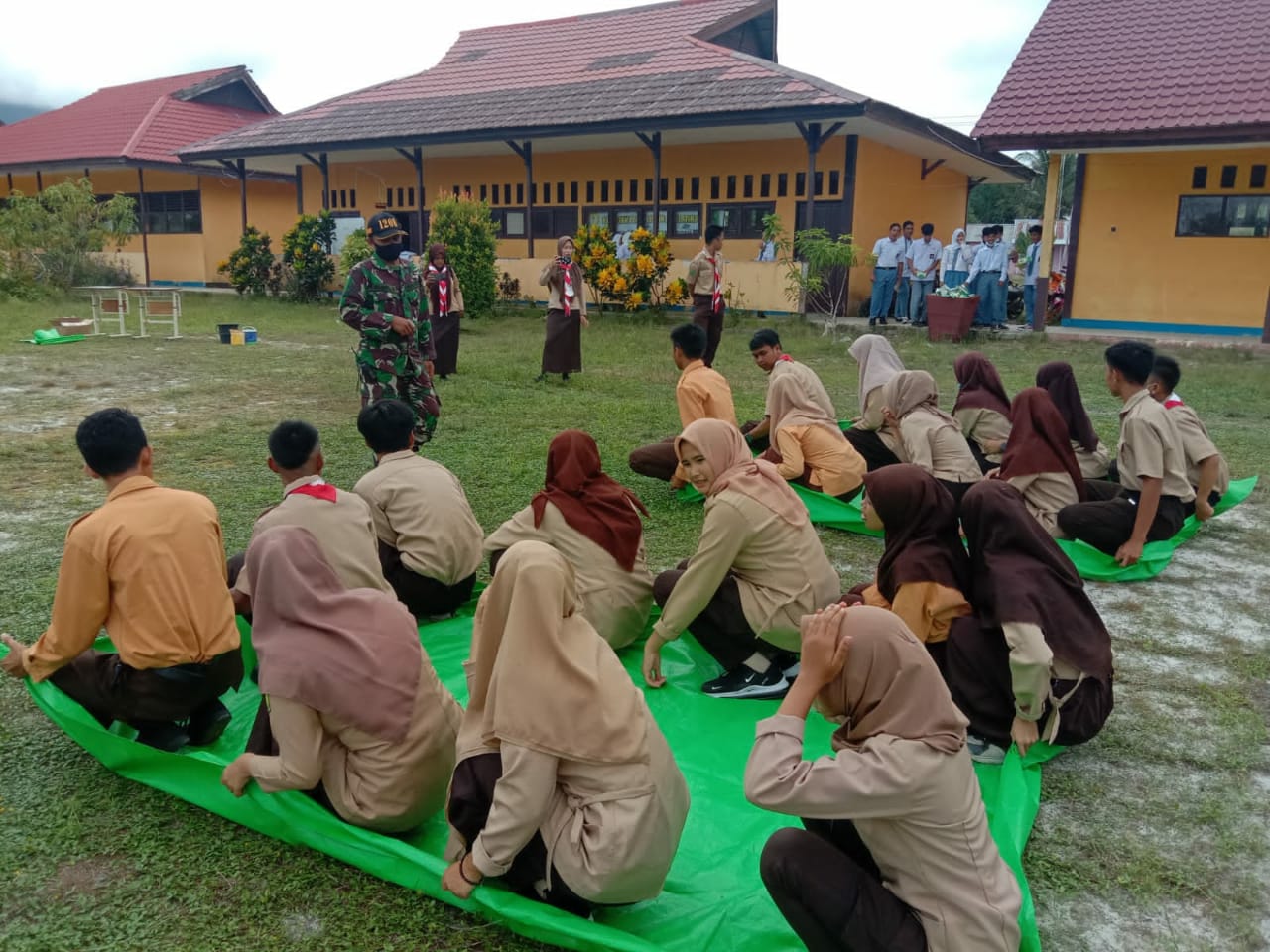 Sambas – Maspolin.id ||Personil Satgas TMMD Imbangan kodim 1208/Sbs, Sertu Riyono selain melaksanakan Fisik juga melaksanakan Non Fisik salah satunya melaksanakan pelatihan teori kepada Pramuka Saka Wira dan pengenalan Outbound yang bertempat di SMAN 02 Temajuk Ds. Temajuk Kec. Paloh Kab. Sambas. Selasa (05/10/21)