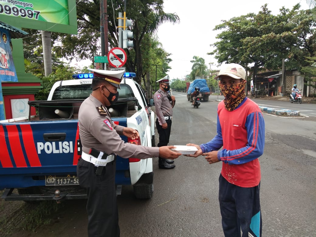 MASPOLIN || BOJONEGORO – Satlantas (Satuan Lalu Lintas) Polres Bojonegoro melalui Unit Dikyasa Lantas yang dipimpin langsung Kasatlantas Polres Bojonegoro membagikan nasi kotak kepada masyarakat yang membutuhkan serta memberikan himbauan keselamatan berlalu lintas bagi masyarakat pengguna jalan, Jum’at (8/1/21).