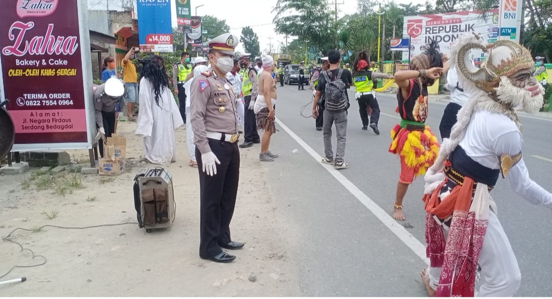 Kali ini Satlantas Polres Sergai dalam menggelar Operasi Yustisi punya cara unik untuk mengingatkan dan menghimbau masyarakat yaitu dengan berkolaborasi dengan penggiat seni seperti Reog, Pocong, Kuntilanak, Tuyul dan Badut.