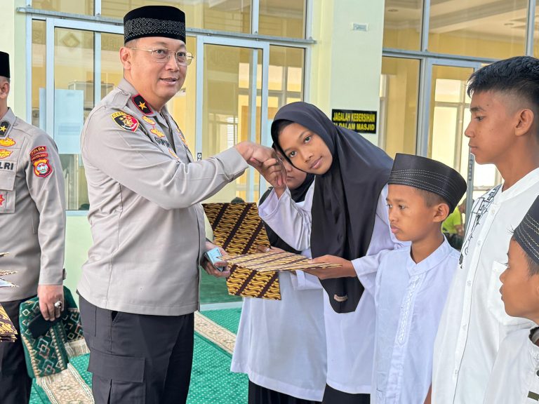 SUMBAR – Maspolin.id|| Wakil Kepala Kepolisian Daerah (Waka Polda) Sumbar Brigjen Pol Gupuh Setiyono serahkan santunan kepada anak yatim yang dilaksanakan usai pelaksanaan sholat Jumat di Mesjid Ar Rahman Mapolda Sumbar, (15/3/2024)