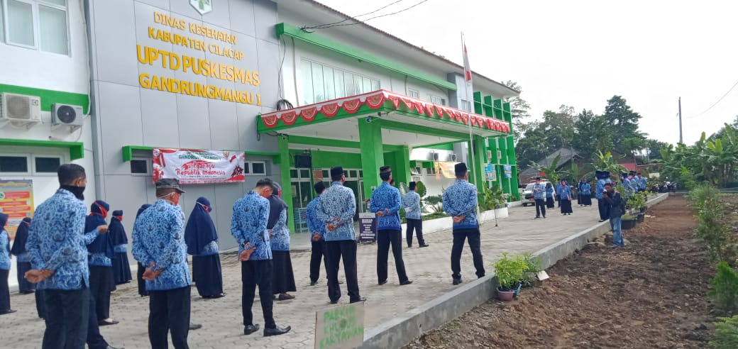 MASPOLIN.ID || CILACAP – Upacara Bendera dalam rangka HUT RI ke-75 dilingkungan Unit Pelaksana Teknis Daerah (UPTD) Puskesmas Gandrungmangu I Kabupaten Cilacap, digelar secara sederhana dihalaman Puskesmas, dengan Pembina Upacara, Kepala UPTD Puskesmas Gandrungmangu, Agung Budiyono, SKM, Senin (17/8/2020).