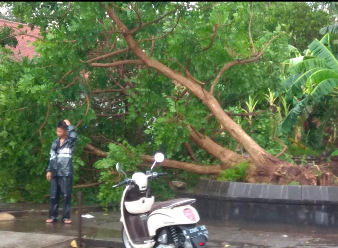 Akibatnya, pohon-pohon tumbang, beberapa baliho di pinggir jalan roboh, dan atap kios beterbangan.