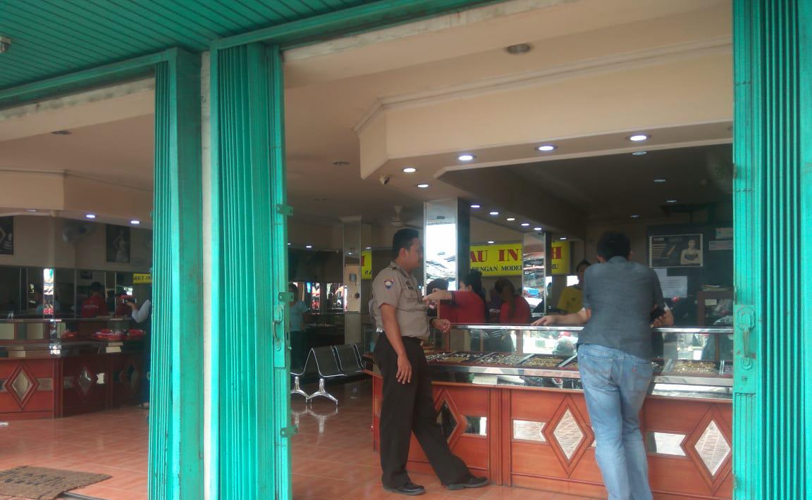 Terlihat anggota Polsek Ciruas, berkomunikasi (patroli dialogis) dengan penjaga dan pemilik toko emas. Panit Reskrim Polsek Ciruas Ipda Ferry Andriatna dan anggota Bhabinkamtibmas Brigadir Gungun.