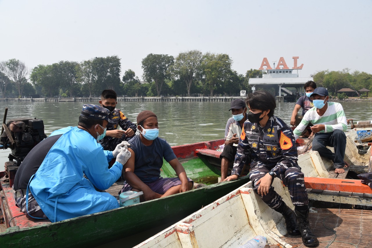 Tidak hanya sanggong nelayan saat mencari ikan di seputaran pantai Kampus AAL Bumimoro saja, vaksinator Akademi TNI Angkatan Laut (AAL) juga sambangi langsung dan berikan suntikan vaksin bagi masyarakat maritim di markas paguyuban Nelayan Morokrembangan yang berlokasi di daerah Kalianak, Surabaya, Rabu (25/8).