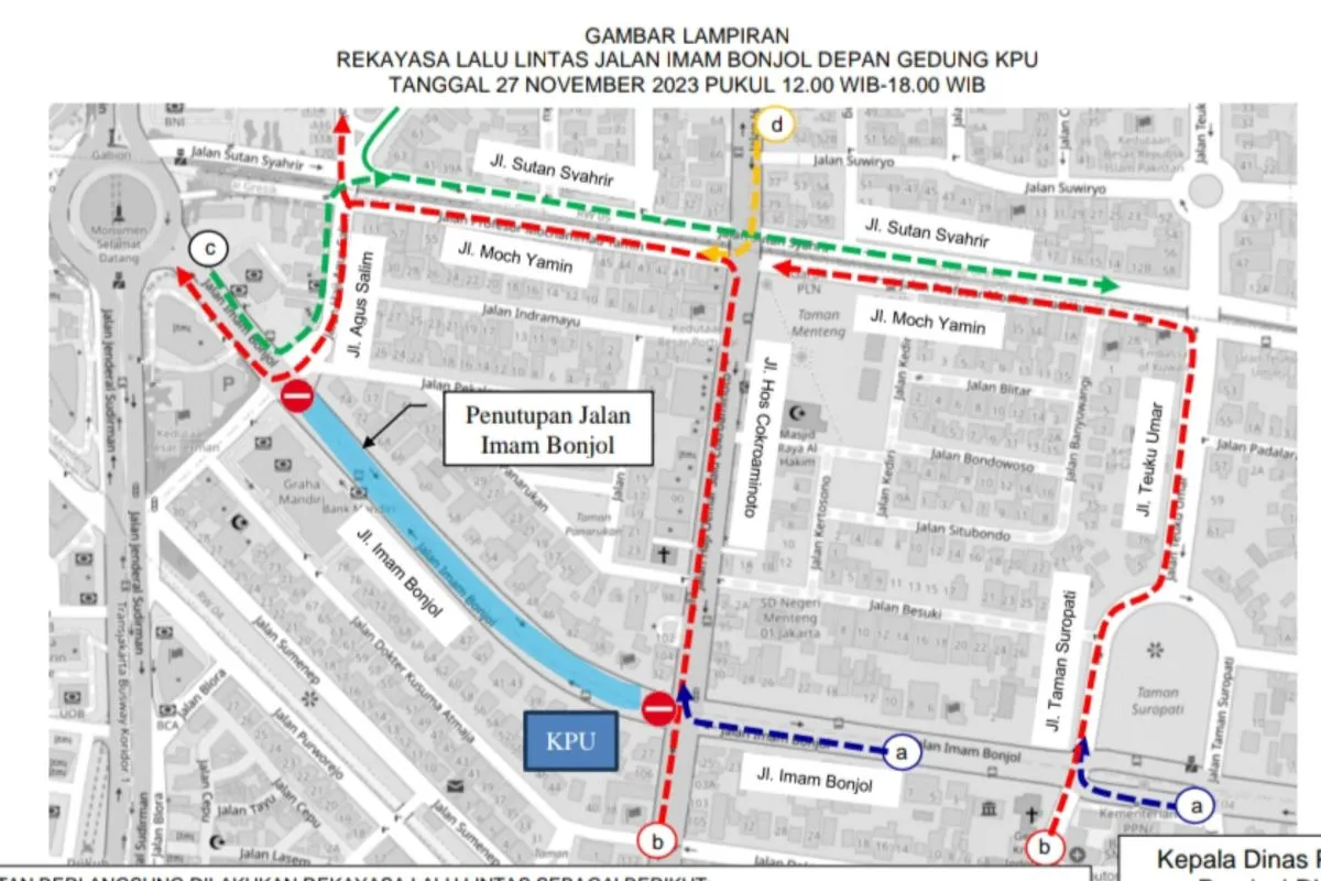 JAKARTA (ANTARA) – Maspolin.id|| Dinas Perhubungan DKI Jakarta memberlakukan rekayasa lalu lintas untuk menunjang kelancaran Deklarasi Kampanye Damai Pemilu Tahun 2024 di Gedung Komisi Pemilihan Umum (KPU) Republik Indonesia Jalan Imam Bonjol, Menteng, Jakarta Pusat hari ini.