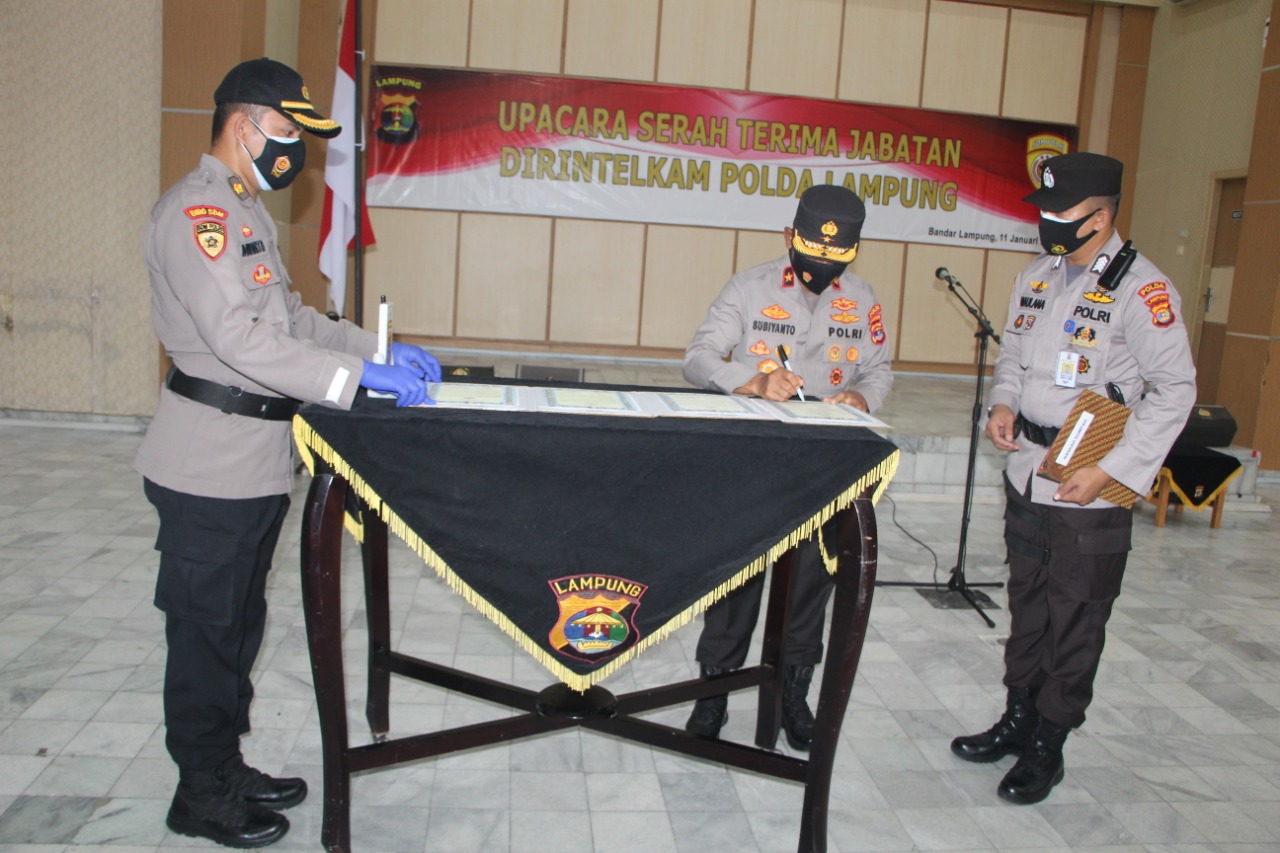 Direktur Intelkam Polda Lampung yang sebelumnya dijabat Brigjend Pol Amran Ampulembang digantikan oleh Kombes Pol Drs Susilo Rahayu Irianto, serta penandatanganan serah terima jabatan dan pakta integritas serta anti narkoba, bertempat di Aula GWS Polda Lampung, Senin (11/01/2021).