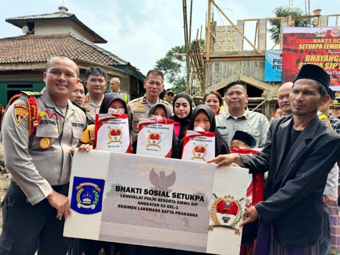 Bakti sosial Setukpa Lemdiklat Polri bersama Bhayangkari Cabang 04 Setukpa dan siswa Sekolah Inspektur Polisi (SIP) angkatan ke-53 gelombang I tahun 2024 Resimen Laksmana Satya Prakasha (LSP – 53) kali ini dalam bentuk pembagian 100 paket alat tulis untuk anak sekolah dan 100 paket makanan, serta material bangunan untuk pembangunan madrasah Alhidayah yang berlokasi di Kampung Cibeurih Desa Cilangkap Kecamatan Lengkong Kabupaten Sukabumi Jawa Barat, pada Rabu (01/05/2024).