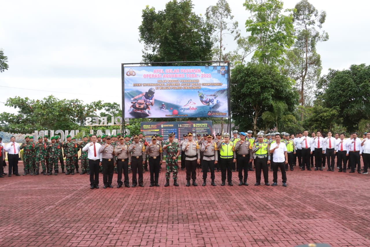 Simalungun – Maspolin.id|| Kegiatan “Apel Gelar Pasukan Operasi Aquabike Toba-2023” dilaksanakan pada hari Jumat, 17 November 2023, mulai pukul 08.00 WIB di Lapangan Apel Mako Polres Simalungun, Jln.Jhon Horailam Saragih, Kecamatan Pamatang Raya Kabupaten Simalungun. Kegiatan ini merupakan bagian dari upaya pengamanan event internasional Aquabike Jetski World Championship yang akan diadakan di wilayah hukum Polres Simalungun.