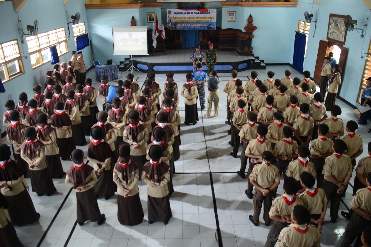 Denpasar,Maspolin.id – Sebanyak 78 orang pelajar SMP Albanna Denpasar Bali mengikuti Program Pelatihan Dasar Bela Negara, Pembentukan Disiplin, dan Pembetukan Karakter Jiwa Bahari di Pangkalan TNI AL Denpasar Bali.