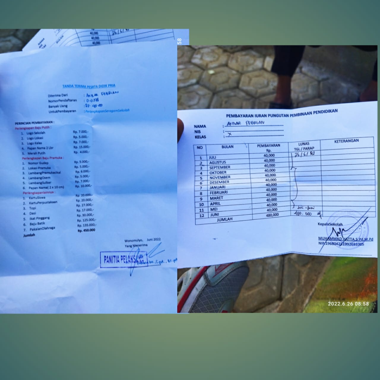 Siswa baru tidak diperbolehkan untuk beli diluar dari pada sekolah karna untuk keseragaman dan pihak sekolah sudah menentukan berapa besar biaya yaitu Rp 450.000 per siswa dengan perincian-perincian yang sudah ditentukan pihak sekolah di nota bukti bayar siswa. Bukan cuma pembayaran keseragaman setiap siswa baru juga dibebankan dana pungutan sebesar Rp 480.000 dikonfirmasi lewat WA dan pada saat rapat melalui kepala sekolah Muhammat Hatta menjelaskan bahwa uang itu akan dipake untuk Pelayanan murid, membayar cleaning service serta membayar dua orang satpam dan menurut kepala sekolah SMA NEGRI 1 WONOMULYO MUHAMMAD HATTA, bahwa apa yang dia lakukan itu sudah sesuai dengan permen Dikbud no 44 tahun 2012.