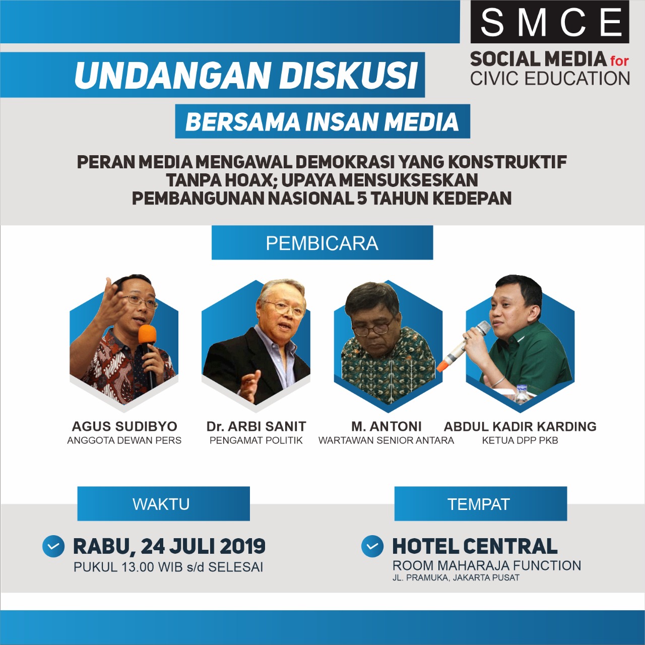 Jakarta,Maspolin.id – Lembaga nirlaba Sosial Media for Civic Education (SMCE) akan menggelar diskusi dengan kalangan insan media bertema ; “Peran Media Melawan Hoax dan Mengawal Demokrasi Secara Kontruktif Demi Suksesnya Pembangunan 5 Tahun Kedepan”. Acara ini rencananya akan digelar Rabu, (24/07/2019) jam 13.00 WIB hingga selesai di Hotel Cetral.