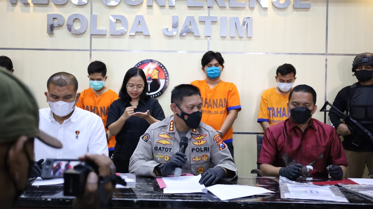 Dari pengungkapan ini, polda jatim meringkus 5 (Lima) tersangka diantaranya, NH, (33) warga Jalan KH. Gasbullah Kelurahan Banjarejo, Kecamatan Pagelaran Kabupaten Malang, SG, (36) warga Jalan Pabean, Kelurahan Pabean, Kecamatan Sedati, Sidoarjo, MZA, (22) warga Desa Pagerwojo, RT 17/ RW 04, Kecamatan Buduran, Sidoarjo, IB, (51) warga Jalan Malik Ibrahim Kuwangsan RT 006/003 Sedati, Sidoarjo dan IF, (27) warga Jalan Petukangan Ampel, Surabaya.