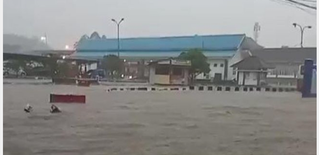 Banjir diduga disebabkan saluran drainase yang tersendat, sehingga air meluap dan membanjiri terminal hingga pemukiman warga.