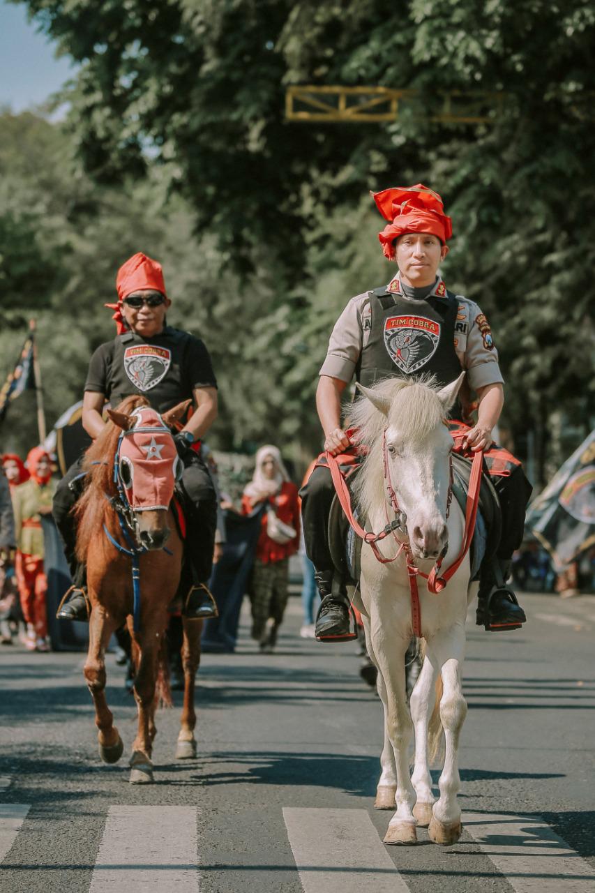 LUMAJANG,Maspolin.id – Ada yang unik, kemarin (5/10) warga Lumajang bisa melihat pasukan Cobra Sultan Hasanuddin tampil di Lumajang. Dengan mengendarai kuda, Sultan Hasanuddin dan 2 pengawalnya serta di ikuti 1 pleton pasukan Cobra dibelakangnya.