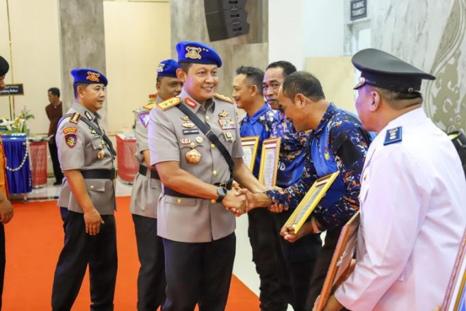 SEMARANG – Maspolin.id|| Kapolda Jateng Irjen Pol Ribut Hari Wibowo dan Waka Polda Brigjen Pol Agus Suryonugroho dianugerahi Brevet Bhayangkara Bahari Kehormatan dari Kepala Polairud Baharkam Polri. Pemberian brevet penghargaan tersebut berlangsung dalam acara Peringatan HUT Polairud ke-74 Tahun 2024 yang digelar di Gedung Borobudur Mapolda Jateng pada hari Selasa, (3/12/2024) pagi, bersamaan dengan acara tersebut sejumlah tokoh masyarakat juga turut menerima Penghargaan dari Ditpolairud Polda Jateng.