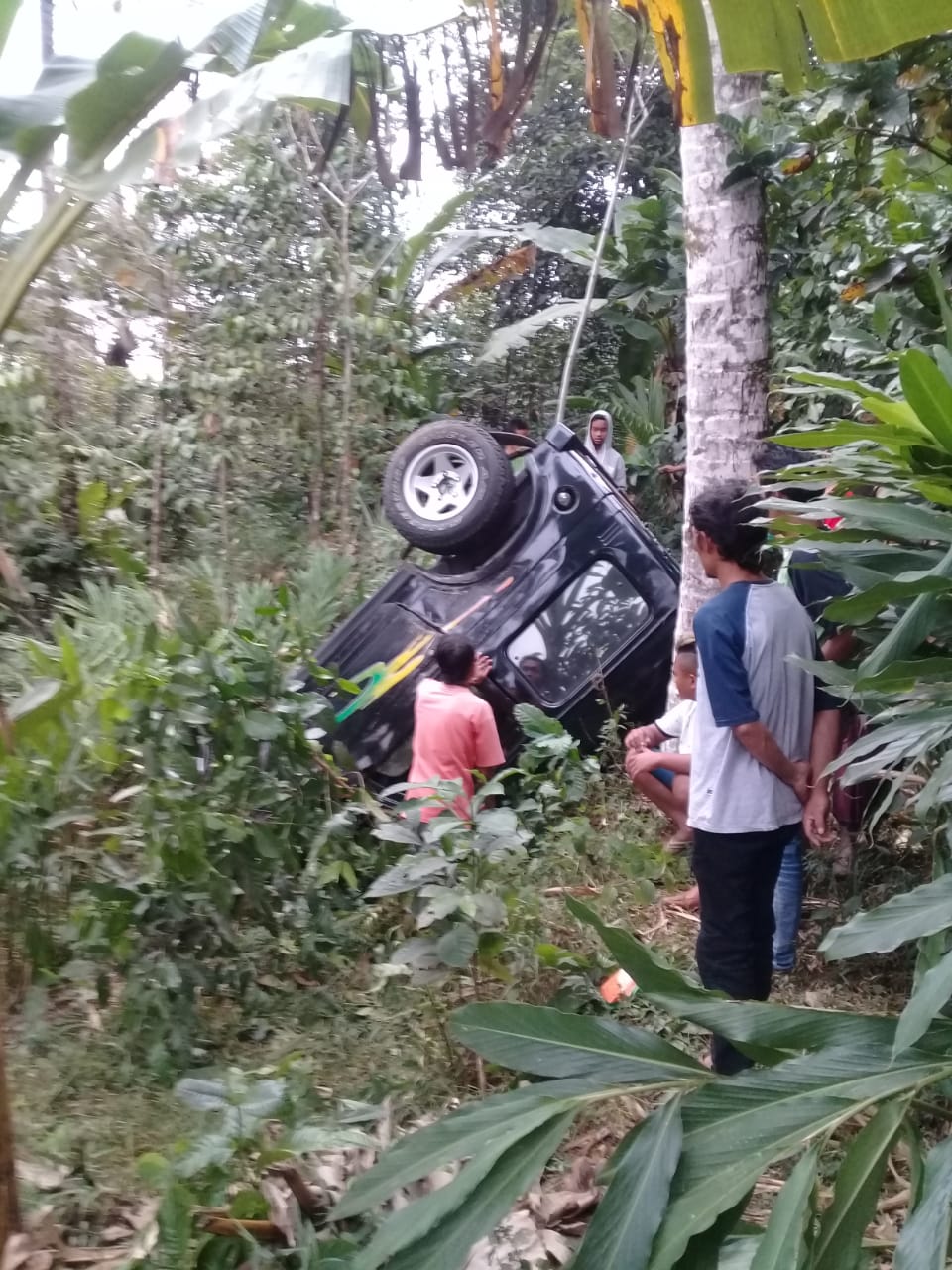 Banyumas, Maspolin.id – Mobil jeep nopol Z-1521-HA sekira pukul 17.00 WIB tiba-tiba nyungsep ke jurang, Minggu (21/7/2019).