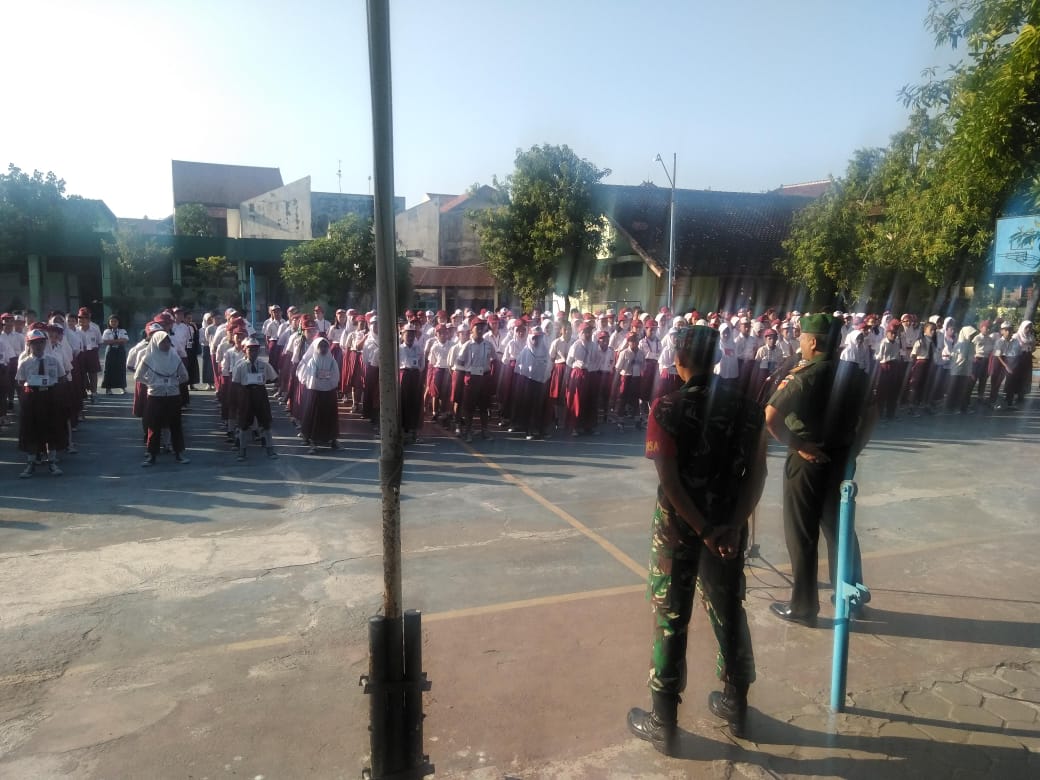Untuk mewujudkan hal tersebut Babinsa Kelurahan Semanggi Koramil 05 Pasar Kliwon Kodim 0735 Surakarta Koptu Maryono bersama 1 orang Babinsa Kelurahan Pasar Kliwon melatihkan Peraturan Baris Berbaris (PBB) di SMPN 6 Surakarta (16/7/2019).