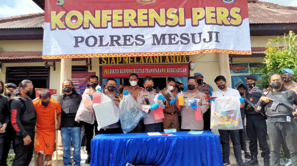 Konferensi Pers dipimpin langsung oleh Kapolres Mesuji AKBP Yuli Haryudo S.E di dampingi Waka Polres Mesuji Kompol Juli Sundara A.Md, Para PJU, Kapolsek Tanjung Raya IPTU Suldi, Anggota Tekab 308 Polres Mesuji, Anggota Polsek Tanjung Raya, Kepala Desa Mukti Jaya Kintoko dan Kepala Desa Harapan Mukti Dedi Irawan.