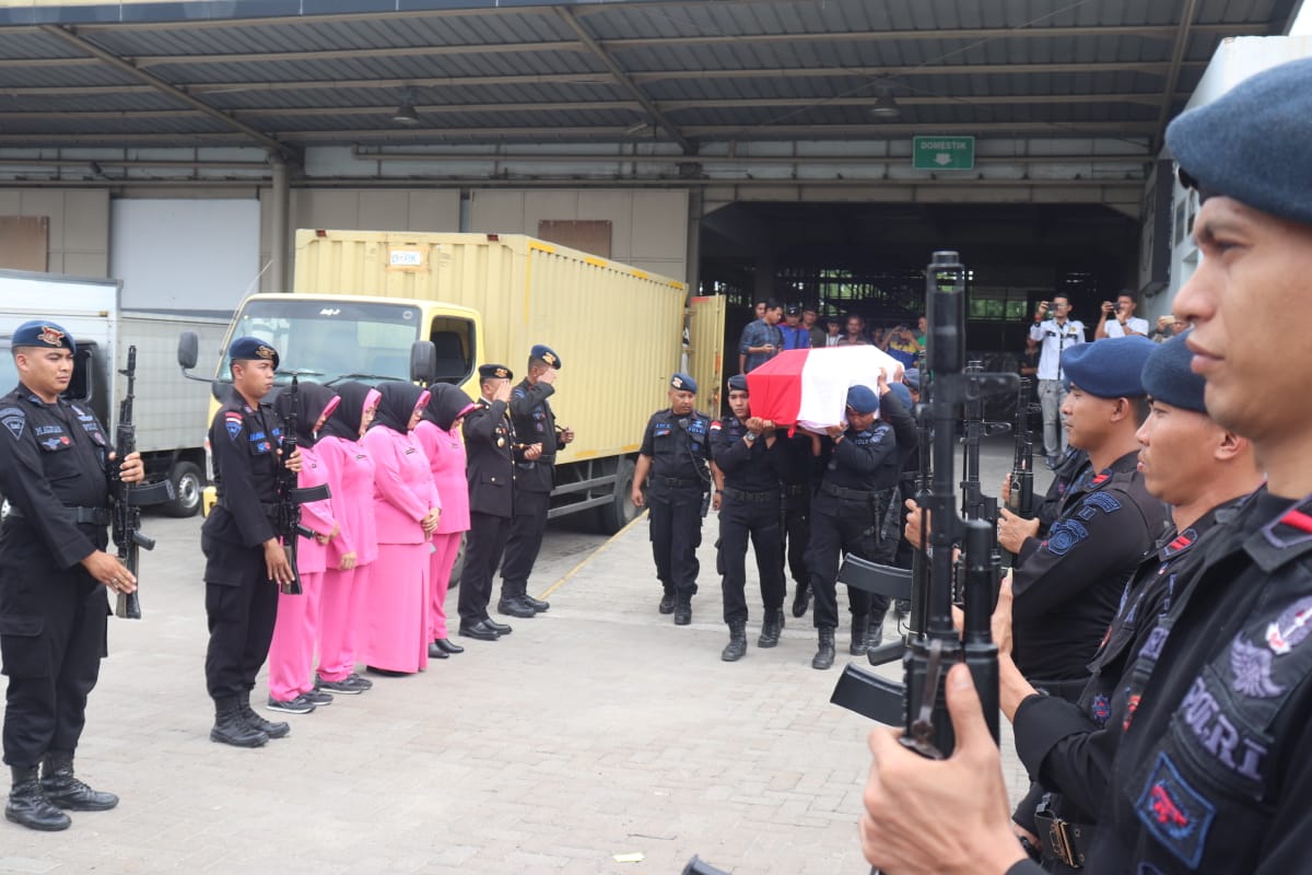 Komandan Satuan Brimob Polda Banten Kombes Pol Reeza Herasbudi beserta anggota Satbrimobda Banten menjemput jenazah Bharaka (Anumerta) M. Saeful Mudori dari Terminal Cargo Bandara Soekarno Hatta Tangerang Banten, untuk diantarkan ke rumah duka Kampung Nagrog RT 01/ 01 Kelurahan Banyu Mundu Kecamatan Kaduhejo Kabupaten Pandeglang, Banten, Sabtu (14/12/2019).