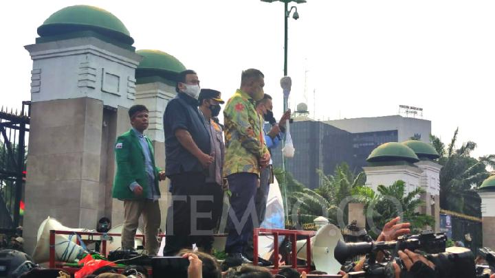 JAKARTA – Maspolin.id|| Tiga Wakil Ketua DPR, Sufmi Dasco, Rahmat Gobel, dan Lodewijk F. Paulus serta Kapolri Jenderal Listyo Sigit Prabowo menemui massa Badan Eksekutif Mahasiswa Seluruh Indonesia atau BEM SI di depan Gedung DPR, Senin sore, 11 April 2022. Mereka berempat bahkan naik ke atas mobil komando.
