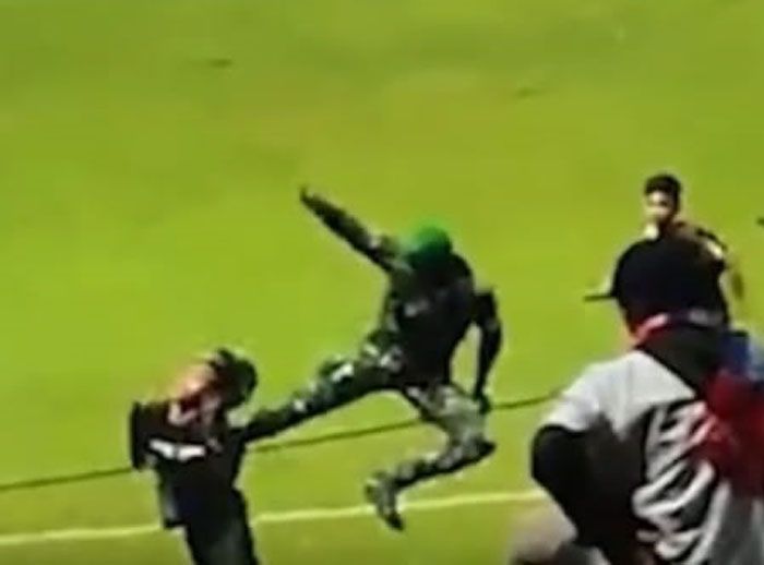 Dalam video yang beredar di media sosial, tampak pria berbaju hitam yang sedang berjalan di sisi lapangan ditendang oleh seorang berseragam TNI.