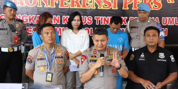 Kepala Kepolisian Daerah (Kapolda) Jawa Tengah Irjen Pol. Dr. H. Rycko Amelza Dahniel, M.Si didampingi Kabid Humas Polda Jawa Tengah, Kombes Iskandar Fitriana Sutisna dan Dirreskrimum Polda Jateng, Kombes Pol Budi Haryanto, melaksanakan konferensi pers yang menetapkan RTS dan FA (41) sebagai tersangka atas kasus penipuan dan penyebaran berita bohong serta keonaran, Rabu, (15/1/2020) di halaman kantor Direktorat Reserse Kriminal Umum Polda Jateng.