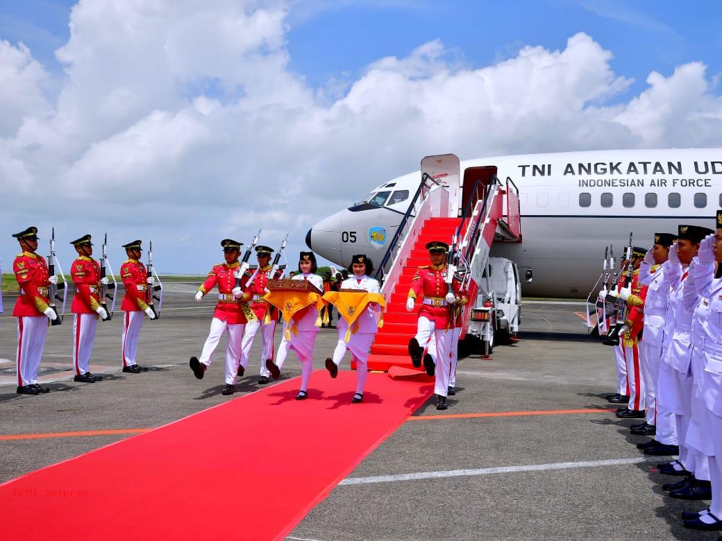 Keduanya menuruni tangga pesawat dengan disambut jajar kehormatan Paspampres, Purna Paskibraka dari Provinsi Kalimantan Timur, dan jajaran Duta Budaya Provinsi Kalimantan Timur. Kedua Purna Paskibraka Duta Pancasila tersebut kemudian menaiki kendaraan taktis “Maung”.