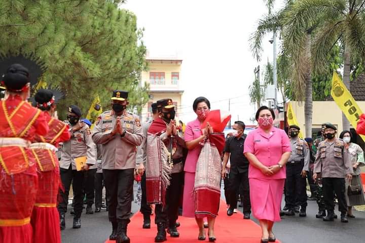 Diiringi tarian etnis, Irjen Pol RZ Panca Putra beserta istri menuju gedung utama Mapolda Sumut. Seluruh kegiatan penyambutan Kapolda Sumut tetap dilaksanakan dengan menerapkan protokol kesehatan guna pencegahan Covid-19.