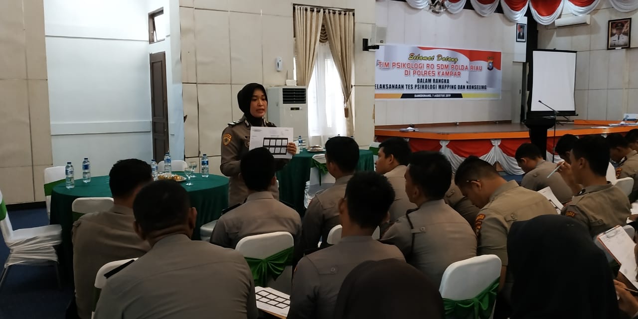 Kegiatan ini diawali Kata Sambutan dan arahan dari Kapolres Kampar yang diwakili oleh Waka Polres Kompol Ricky Ricardo SIK, pada kesempatan ini Waka Polres menyampaikan ucapan selamat datang kepada Tim Psikologi Biro SDM Polda Riau yang akan melaksanakan Tes Psikologi, Mapping dan Konseling bagi personel Jajaran Polres Kampar.