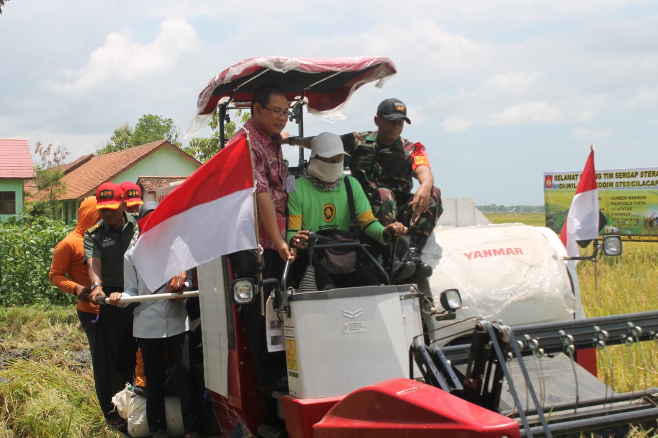 Tim Sergap Sterad dan Dandim Cilacap berkesempatan menaiki mesin pemanen padi (Komben) untuk melihat secara langsung proses panen yang dilakukan dengan cara modern.