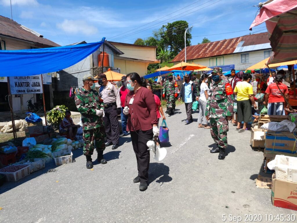 Humbahas, Maspolin.id—Dalam Menyikapi Penyebaran Covid-19 Tiga Pilar Kecamatan Onang Ganjang Terdiri Dari Polri, Danramil, Pemerintah Kecamatan, Serta Tokoh Masyarakat Melakukan Pendisiplinan Protokol Kesehatan Kepada Masyarakat Dipusat Pasar Tradisional Kecamatan Onan Ganjang Kabupaten Humbahas