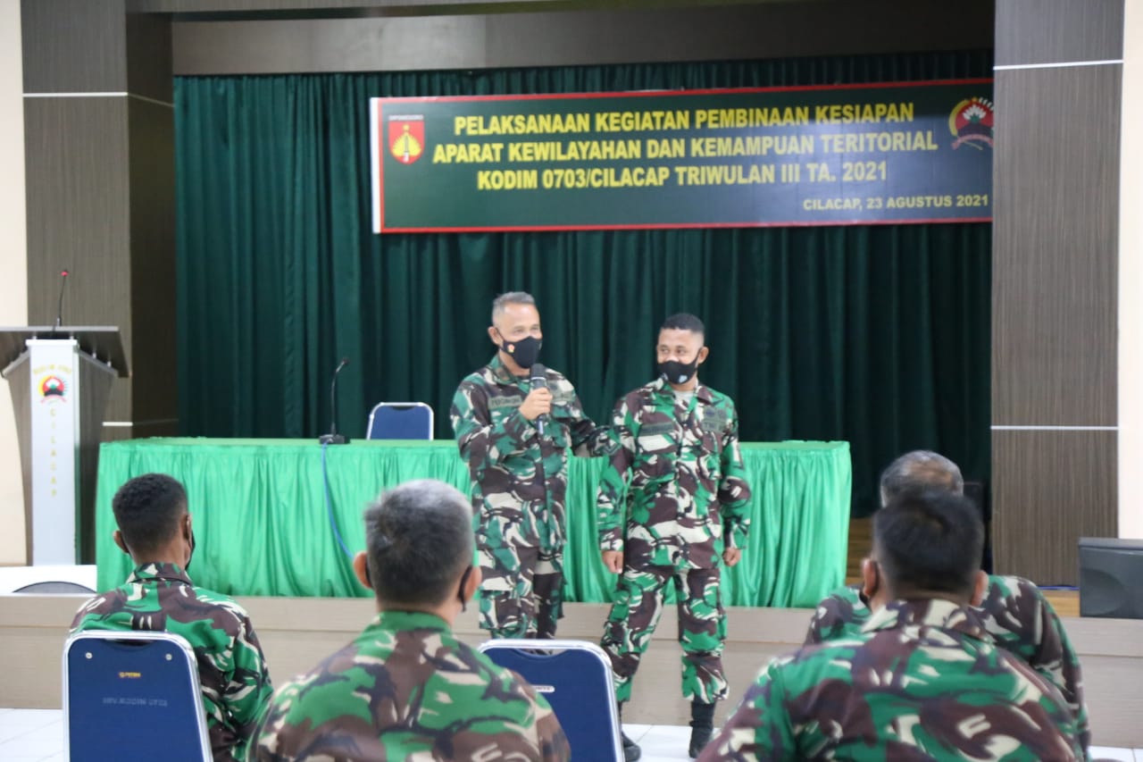 Cilacap,maspolin.id- Tingkatkan kemampuan teritorial para Babinsanya, Kodim 0703/Cilacap menggelar kegiatan Pembinaan Kesiapan Aparat Kewilayahan dan Kemampuan Teritorial (Bin Siap Apwil dan Puanter) Triwulan III Tahun 2021 yang digelar di Aula Satya Kartika, Markas Kodim 0703/Cilacap, Jln. Jenderal Sudirman No. D-1 Cilacap, Senin (23/8).