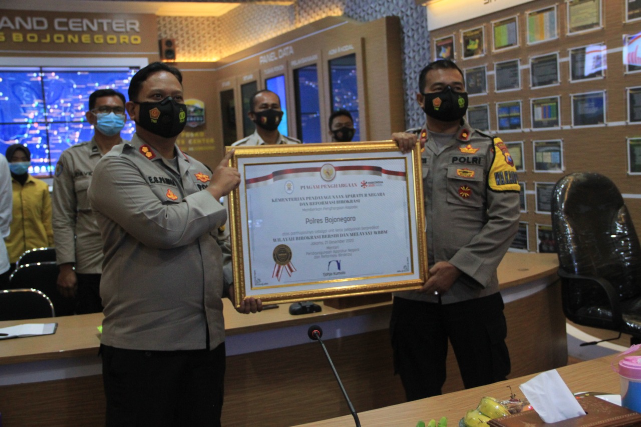 Tepatnya di penghujung tahun 2020, Polres Bojonegoro berhasil meraih predikat Wilayah Birokrasi Bersih Melayani (WBBM) dari Kementerian Pendayagunaan Aparatur Negara dan Reformasi Birokrasi (Kemenpan – RB), Senin (21/12/2020). Polres Bojonegoro menerima penghargaan itu dari Menpan – RB secara virtual di ruang Madrim Command Center (MCC) Polres Bojonegoro.