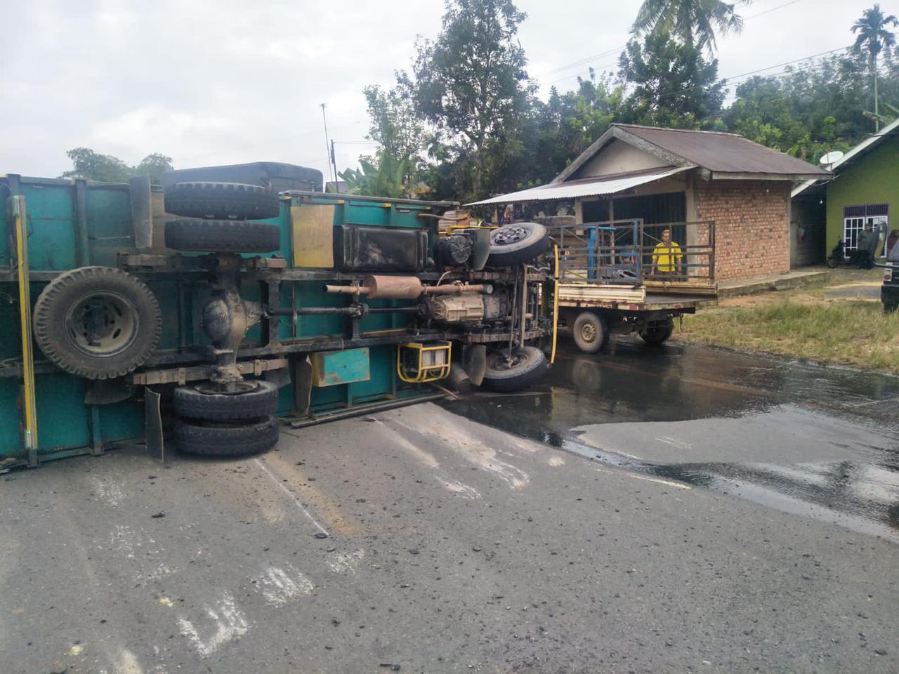 Truk yang bermuatan minyak mentah yang terguling Ditengah jalan raya, menyebabkan tumpahan minyak mentah yang dibawa mobil tersebut diduga dari desa bungku, tumpahan minyak mentah membasahi jalan, dan terlihat juga kondisi mobil truk bermuatan minyak mentah dengan menggunakan Tangki Petak Rakitan.