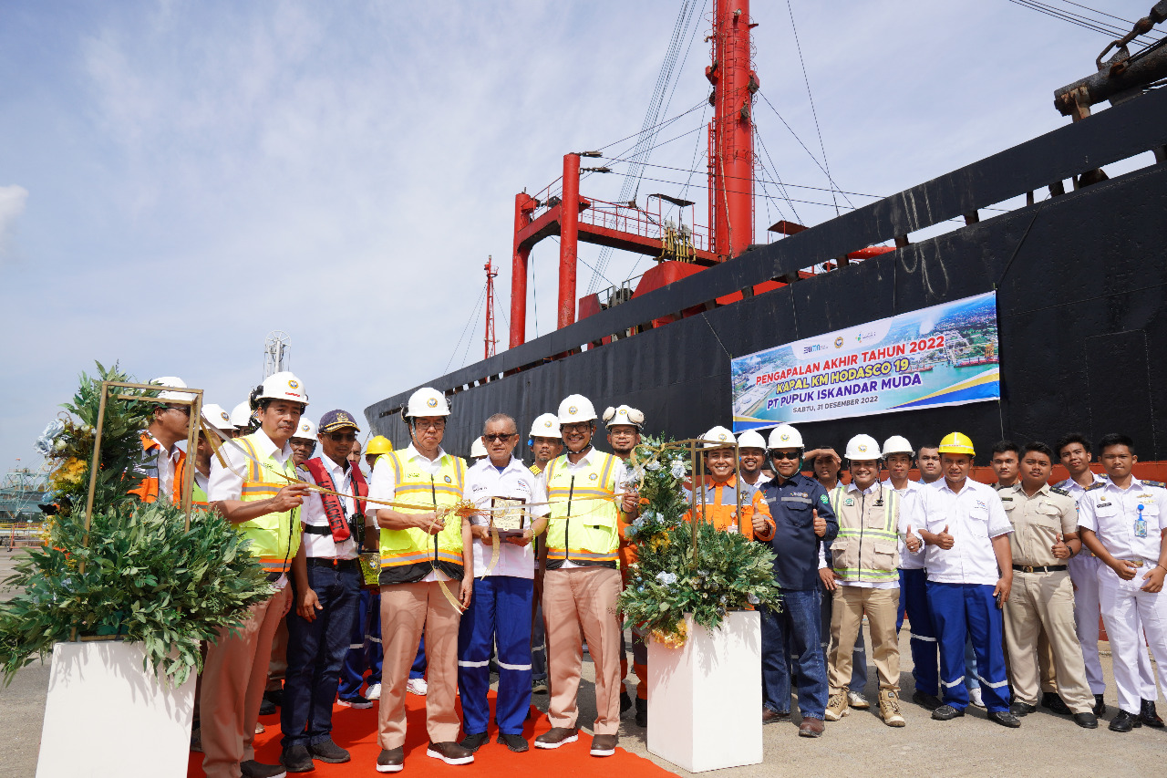 Menutup penjelasannya, Direktur Utama PIM menyampaikan bahwa sepanjang tahun 2022, sebanyak 94 kapal telah bersandar di TUKS PIM dalam rangka mengangkut Pupuk Urea dan Ammonia untuk didistribusikan ke Pasar Domestik maupun untuk kebutuhan Ekspor. Penghujung Tahun 2022 ditutup Pengapalan pupuk urea bag diangkut oleh Kapal Hodasco 19 dengan tujuan Padang, Sumatera Barat dan dilakukan pelepasan Kapal secara langsung oleh Jajaran Direksi PIM didampingi oleh SVP, VP dan Staf bertempat di Pelabuhan PIM.