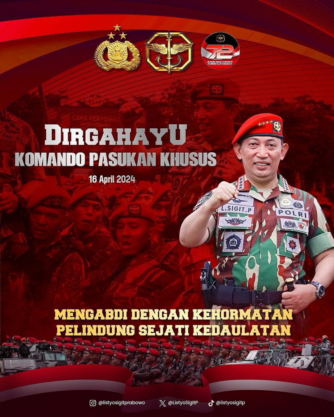 JAKARTA – Maspolin.id|| Kapolri Jenderal Listyo Sigit Prabowo mengucapkan selamat ulang tahun kepada Komando Pasukan Khusus (Kopassus). Pasukan khusus TNI AD ini telah berusia ke-72.