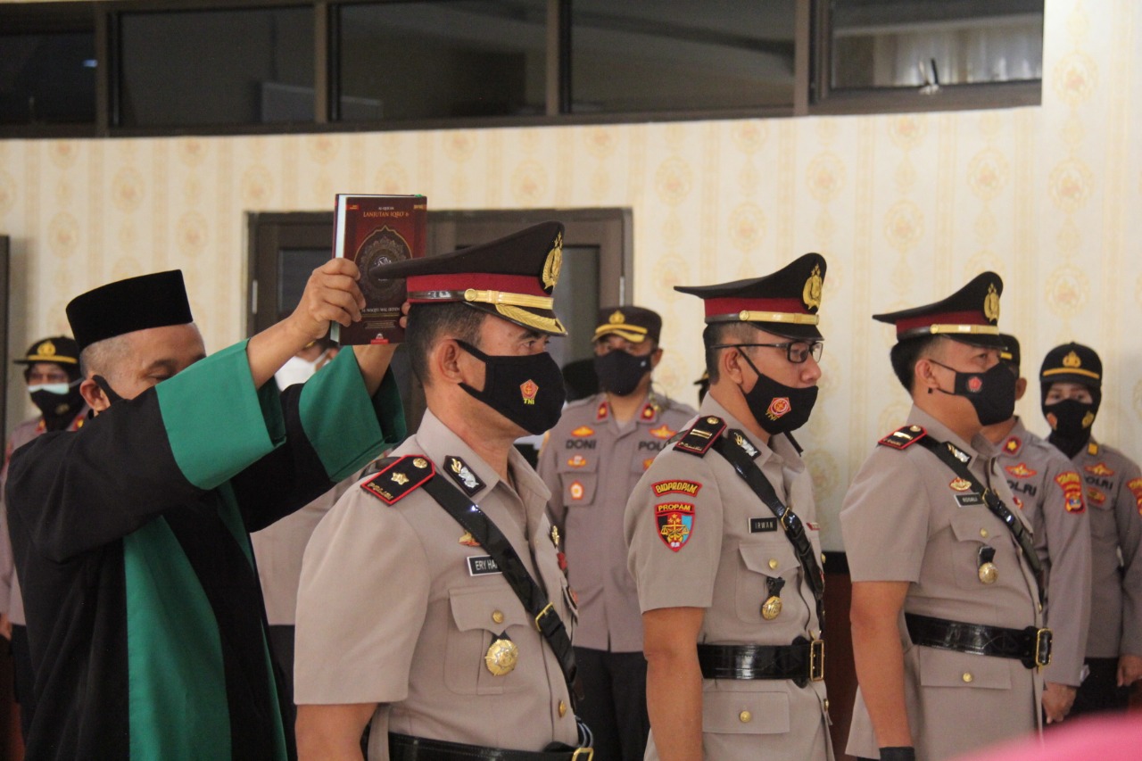 MASPOLIN – Bandar Lampung (Lampung) – Kapolresta Bandar Lampung Kombes Pol Yan Budi Jaya, memimpin serah terima jabatan (sertijab) Kapolsek Kedaton sekaligus melantik jabatan Kapolsek Kemiling dan Tanjung Senang, Sabtu (24/04/2021).