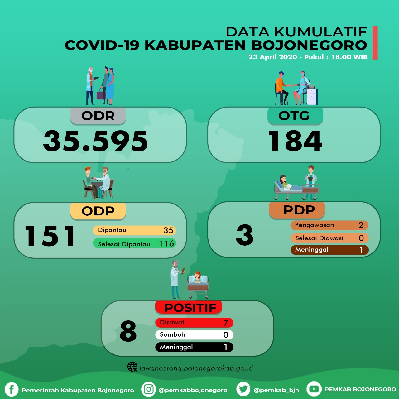 Informasi tentang data sebaran, wilayah kecamatan dan desa terjangkit lebih lengkap dapat dilihat di website http://lawancorona.bojonegorokab.go.id.
