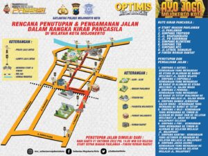Mojokerto Kota – Maspolin.id || Mengantisipasi terjadinya kemacetan panjang saat event Kita Rapatkan Barisan (Kirab) Pancasila, Sabtu (1/10), Sat Lantas Polresta Mojokerto siapkan skema pengalihan arus di sejumlah jalur dan penutupan total di Jalan Bhayangkara dan Jalan PB Sudirman, Rabu (28/09/2022).