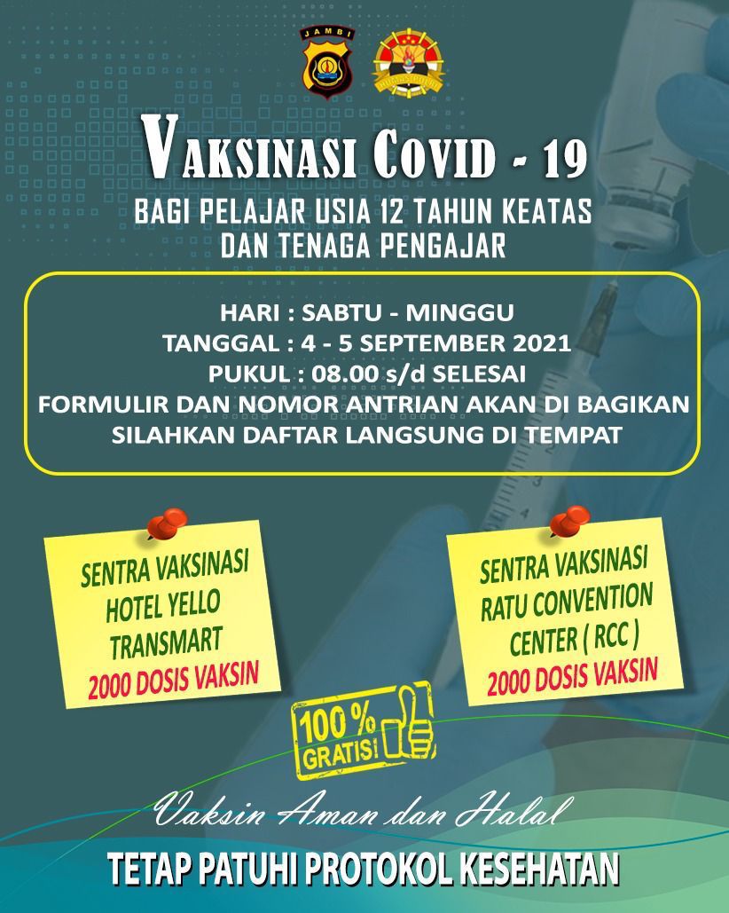 Jambi, Maspolin.id—Besok Hari Sabtu sampai Minggu tanggal 4 sampai 5 September 2021 dari Pukul 08:00 sampai selesai Polresta dan Polda Jambi akan melakukan Vaksinasi Covid 19 bagi pelajar yang berusia 12 tahun keatas dan tenaga pengajar di dua sentra vaksinasi yaitu di Hotel Yello Transmart sebanyak 2000 dosis vaksin dan di sentra vaksinasi Ratu Convention Center (RCC) sebanyak 2000 dosis vaksin.