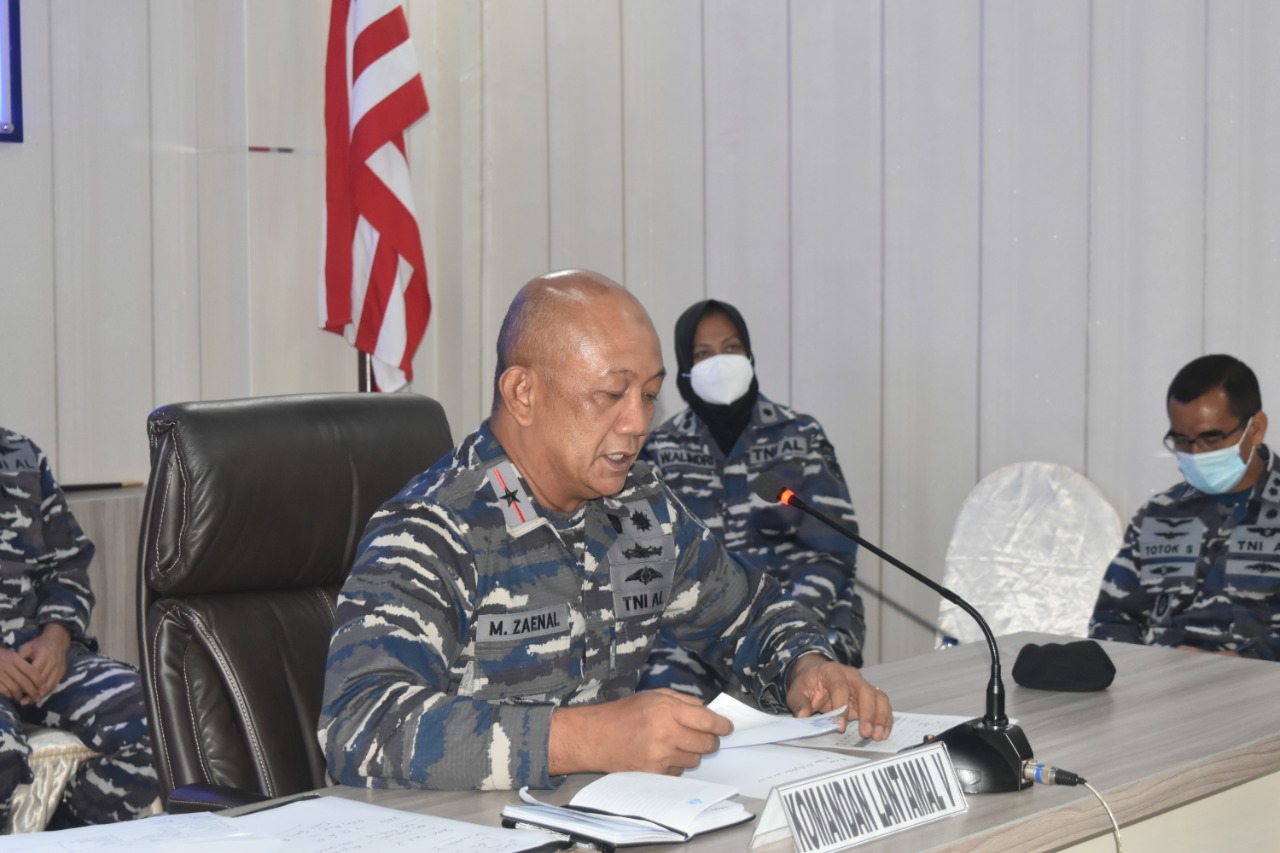 MASPOLIN || SURABAYA – Dalam pelaksanaan Video Conference dengan Kepala Staf Angkatan Laut (Kasal) Laksamana TNI Yudo Margono, S.E., M.M., Komandan Lantamal V Surabaya Laksamana Pertama (Laksma) TNI Mohamad Zaenal, S.E., M.M., M.Soc., Sc., menjelaskan situasi terkini di wilayah kerjanya. Video conference dengan Mabesal Jakarta, dilaksanakan dari Puskodal Markas Komando Lantamal V, Tanjung Perak Surabaya, Jumat (16/10).