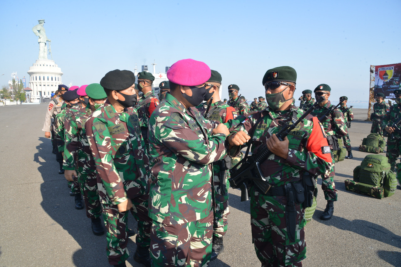MASPOLIN || Surabaya – Wakil Gubernur Akademi Angkatan Laut (Wagub AAL) Brigjen TNI (Mar) Endi Supardi, S.E. mewakili Gubernur AAL Laksamana Muda TNI Edi Sucipto, S.E., M.M. menghadiri upacara pemberangkatan Satuan Tugas Pengamanan Daerah Rawan (Satgas Pamrahwan) Papua TA.2020 Yonif Raider 500/Sikatan yang dilangsungkan di dermaga Madura, Koarmada II, Ujung, Surabaya, Selasa (18/8).