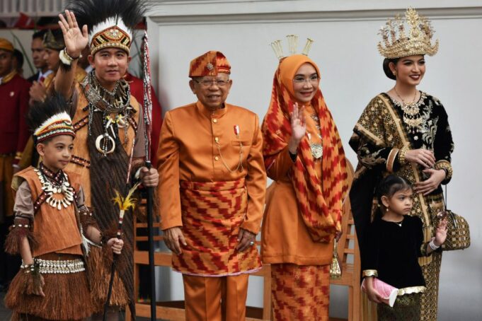 Mengenakan pakaian adat suku Melayu Sambas dari Pontianak, Provinsi Kalimantan Barat, Wapres Ma’ruf dan Ibu Wury tampak menyapa para tamu undangan sesaat setelah tiba di Istana. Sementara itu, Wapres terpilih Gibran hadir dengan mengenakan pakaian adat Papua, lalu Ibu Selvi mengenakan pakaian adat Lampung.